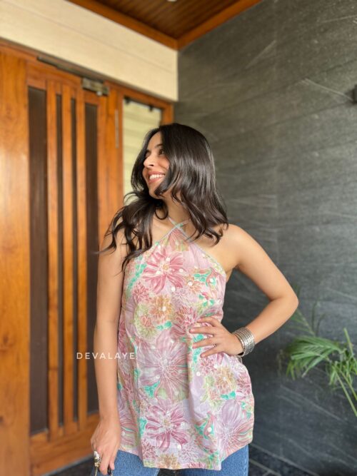 Shop our stunning Ayana Halter Top in Pink, featuring beautiful abstract floral prints on soft mulmul cotton fabric finished with gold foil detailing. The top has been styled with Blue Denims and Diva Bag – Silver.. If you want to go desi, and look stylish at the same time, this top is for you! 🙂