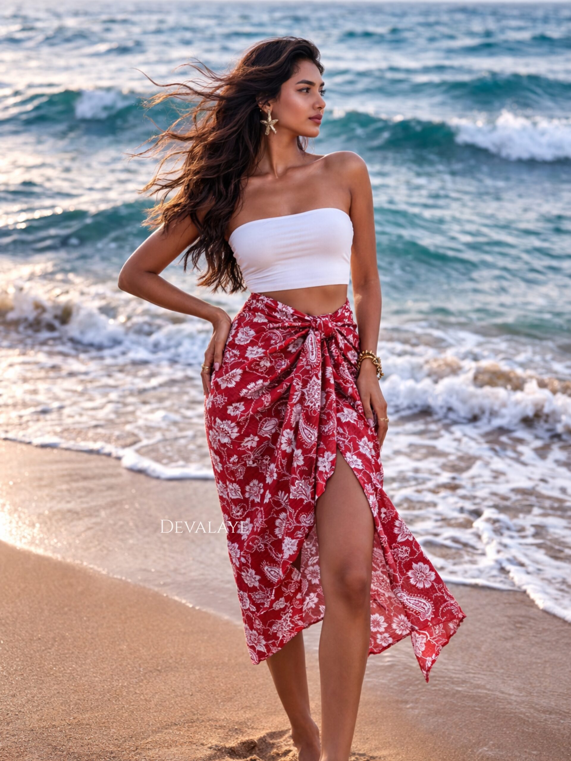 Product Details: Inspired by the timeless paisley motif with a tropical beachy palm leaf print against a rich brick red background, this pareo is the PERFECT beach cover-up that also doubles up as a dupatta.