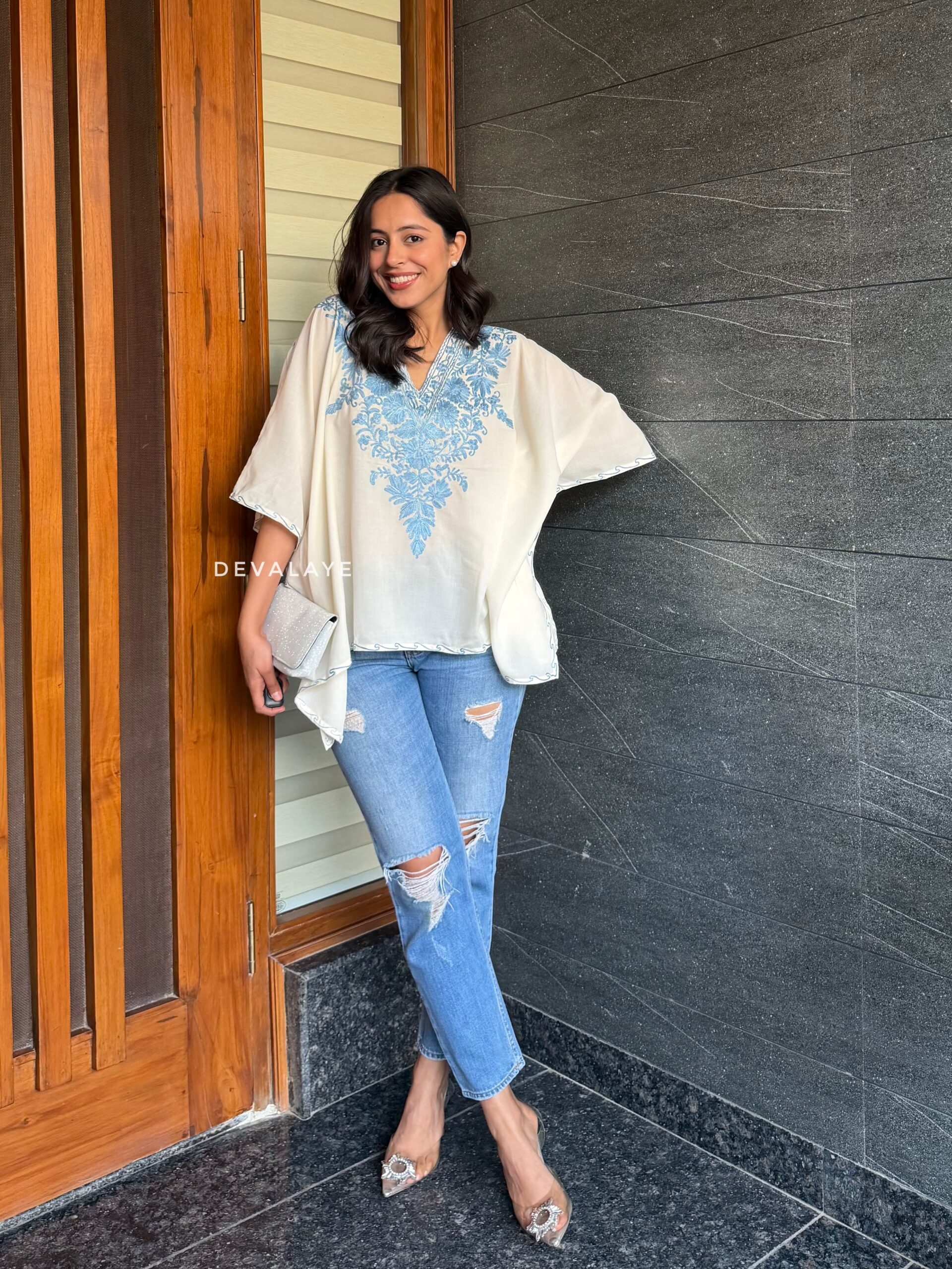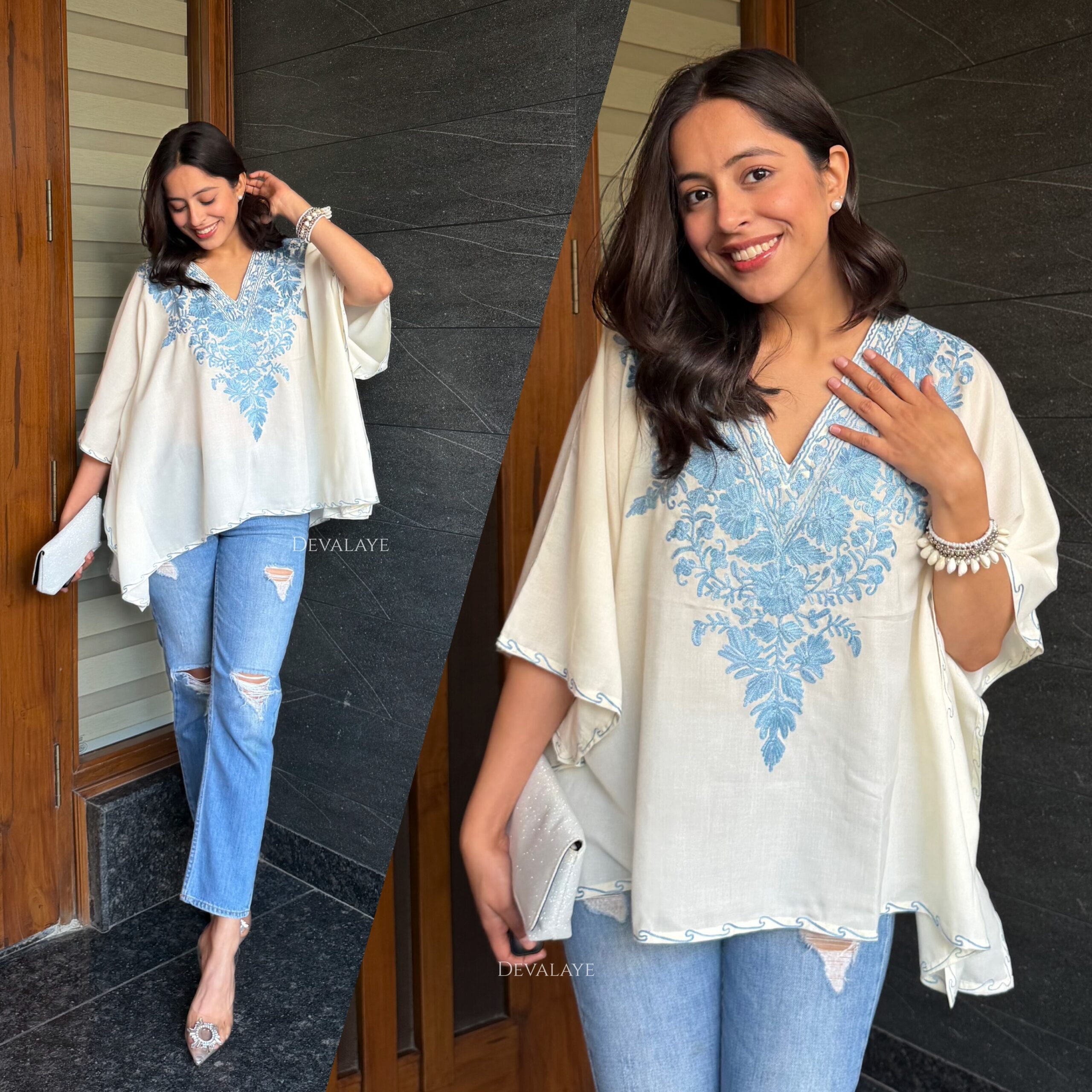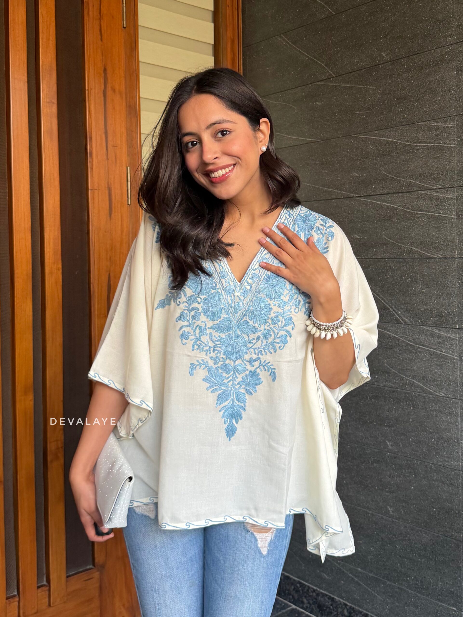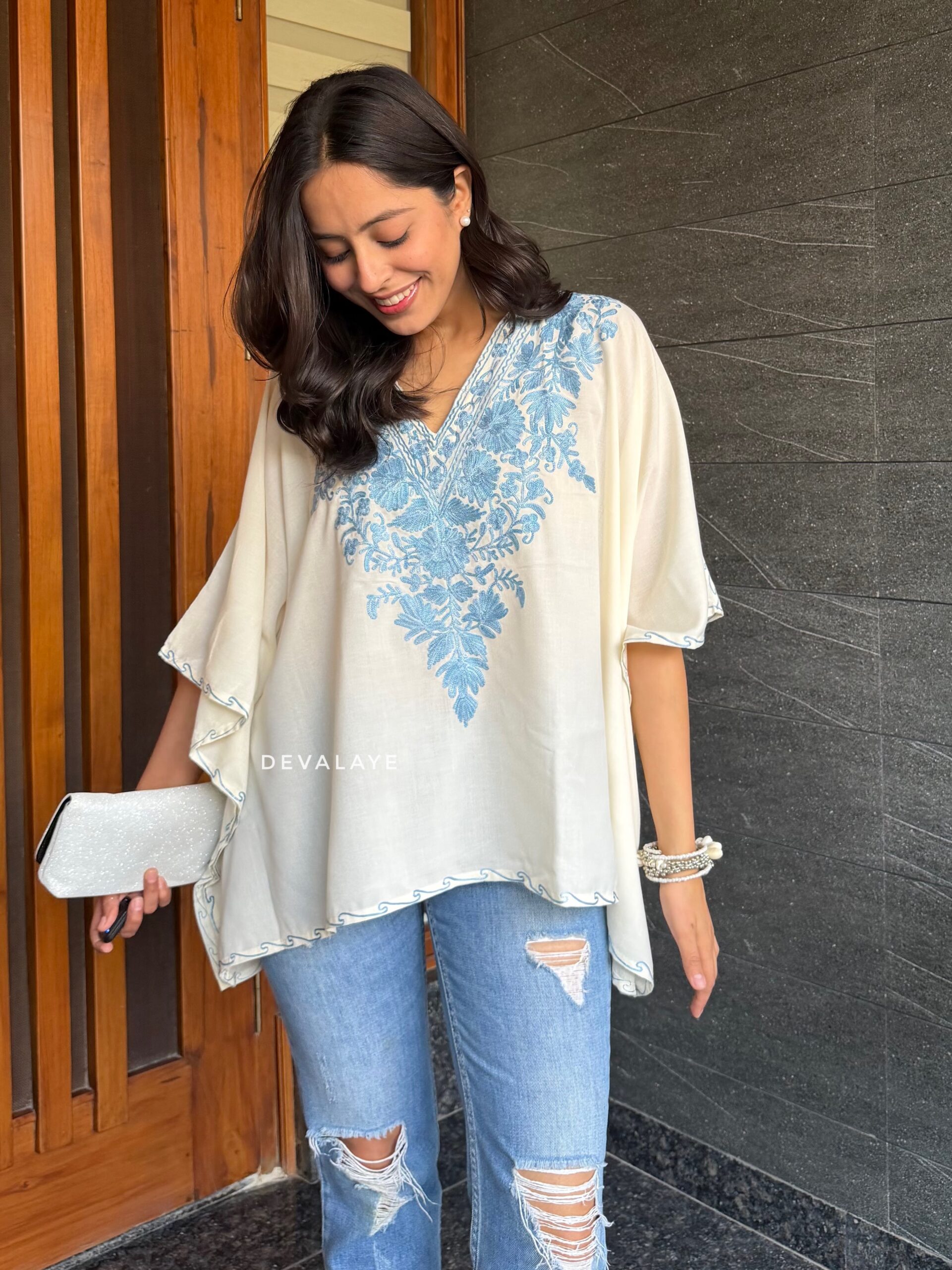 RANG Kaftaan in Blue is a freesize top showcasing Kashmiri Aari embroidery on super soft premium cotton fabric.