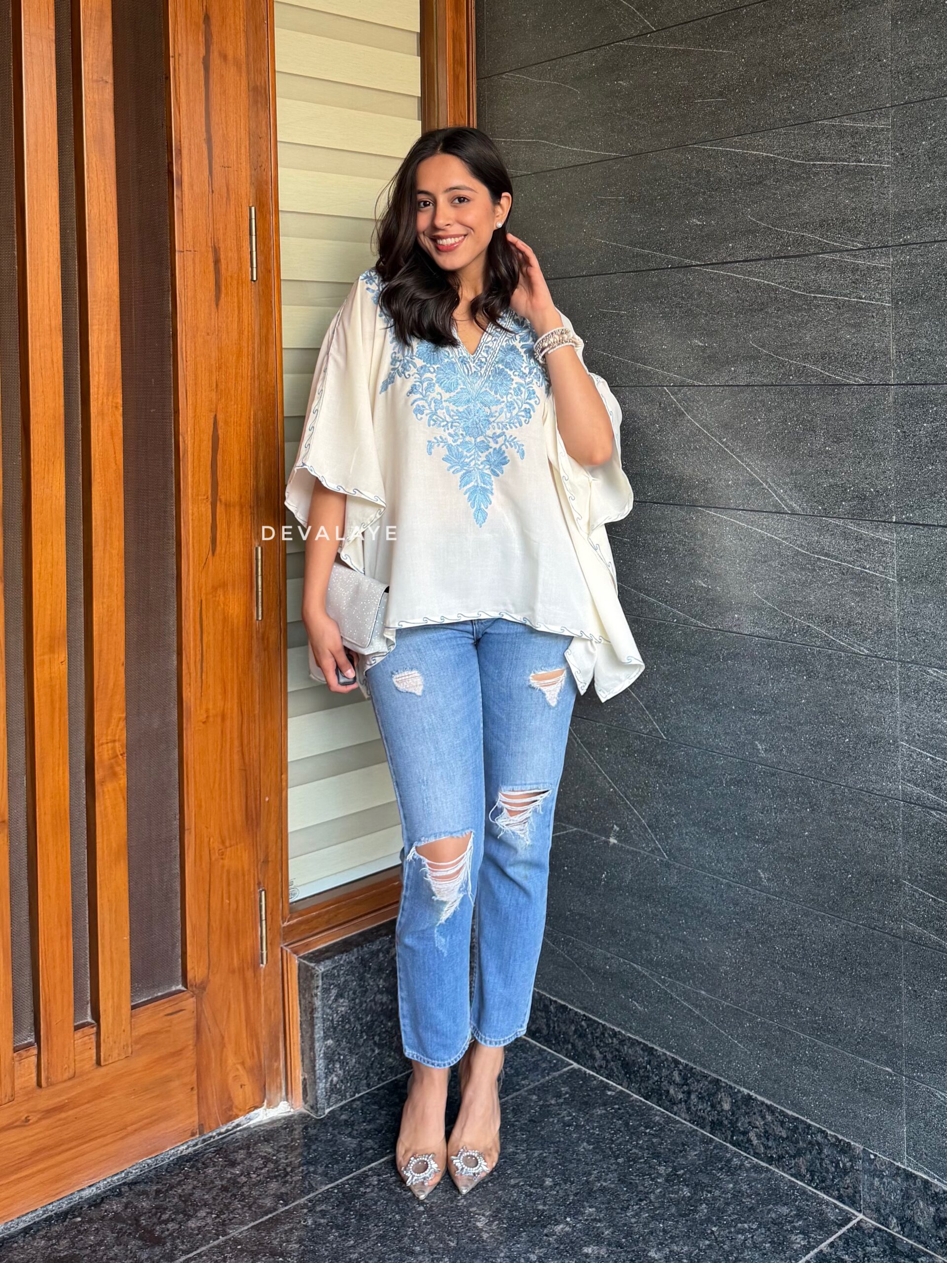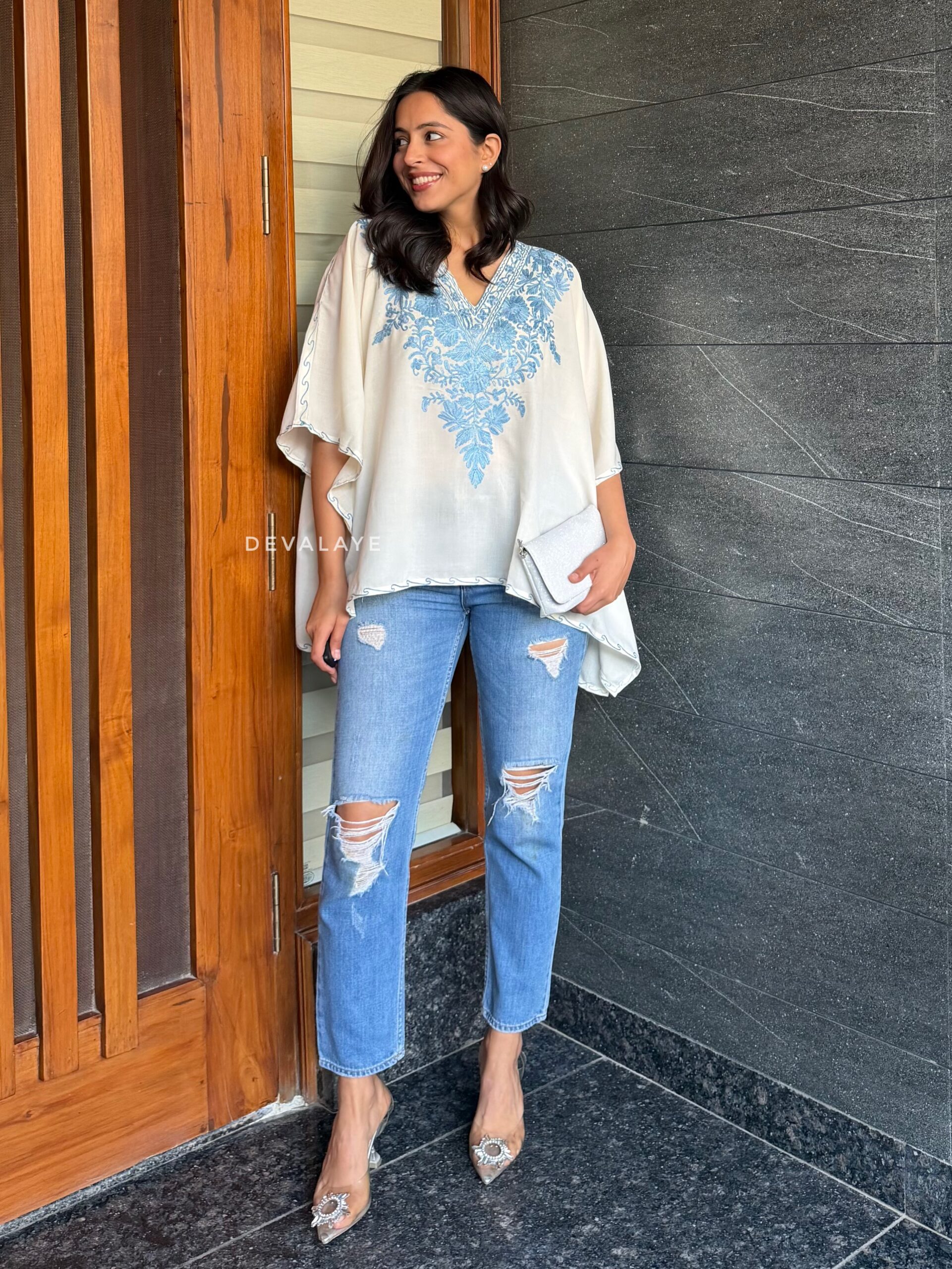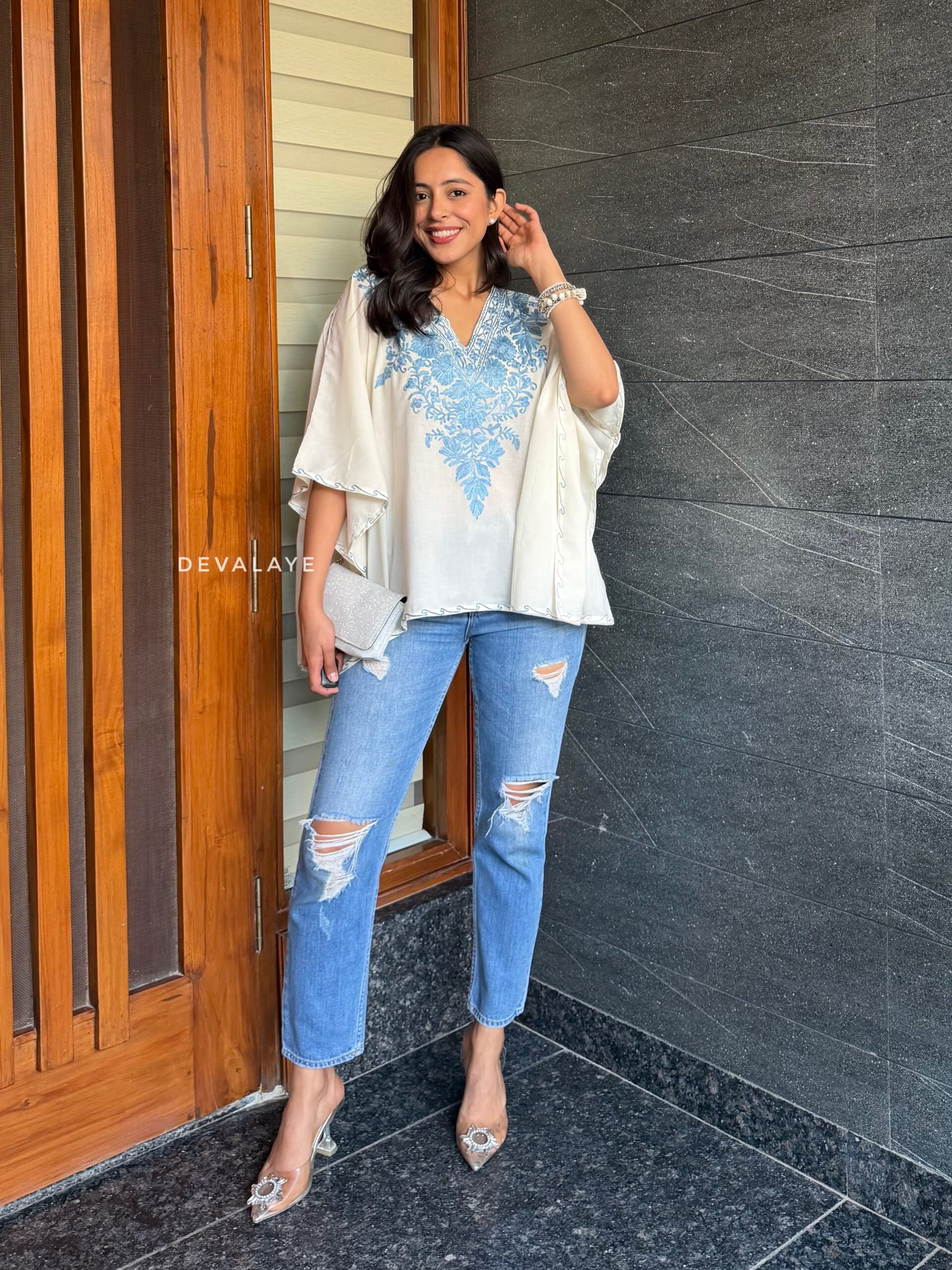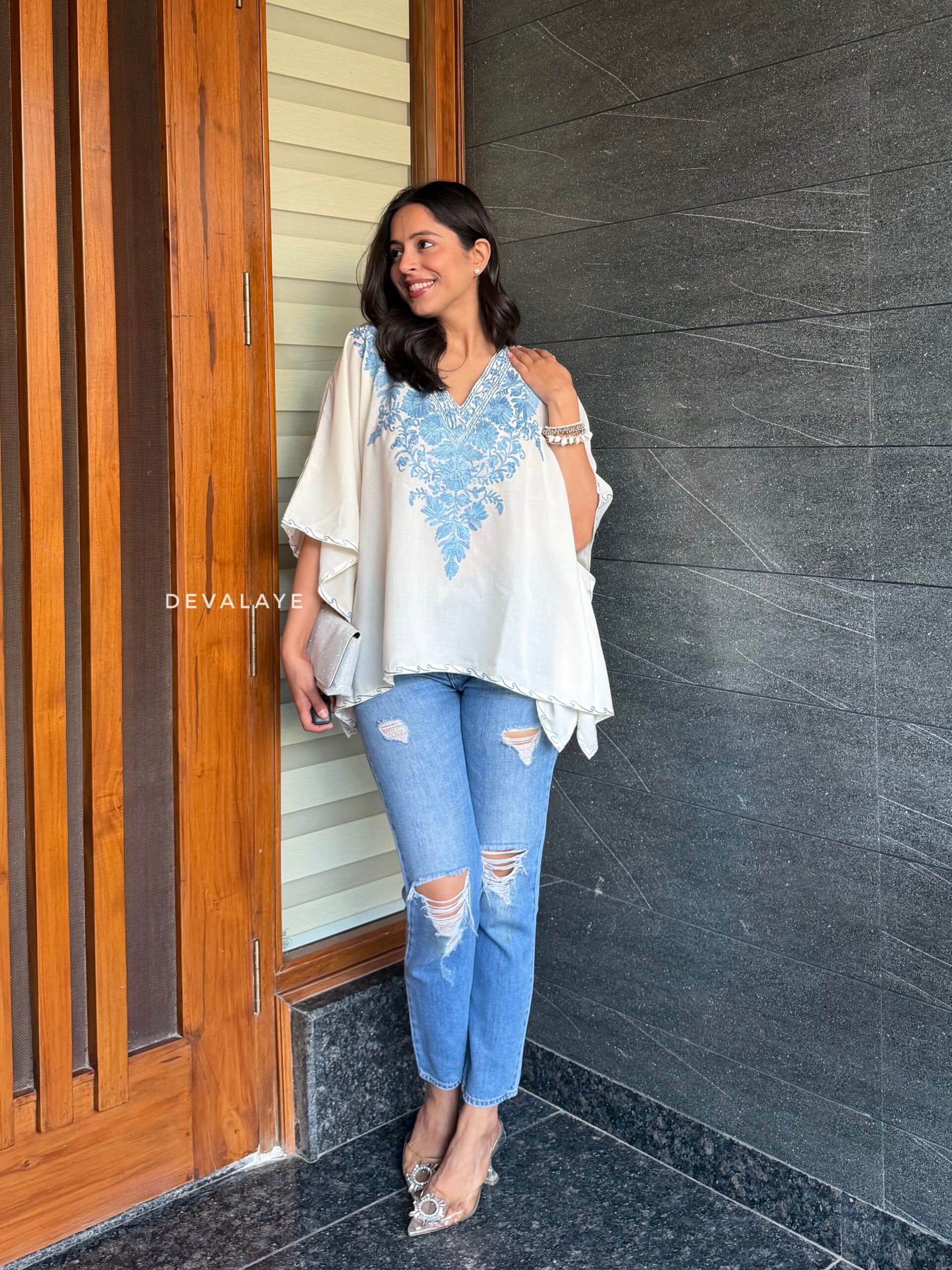 RANG Kaftaan in Blue is a freesize top showcasing Kashmiri Aari embroidery on super soft premium cotton fabric.