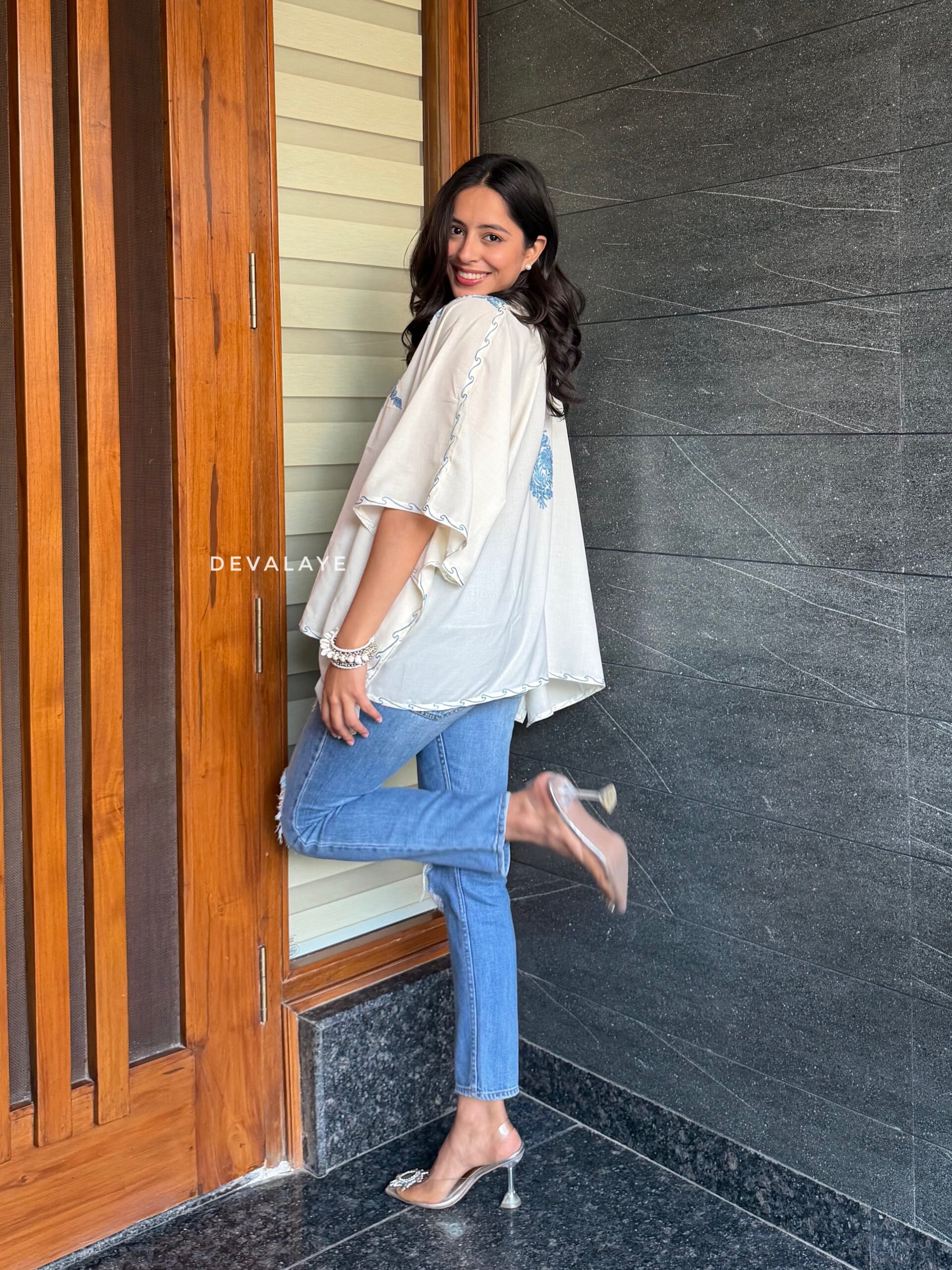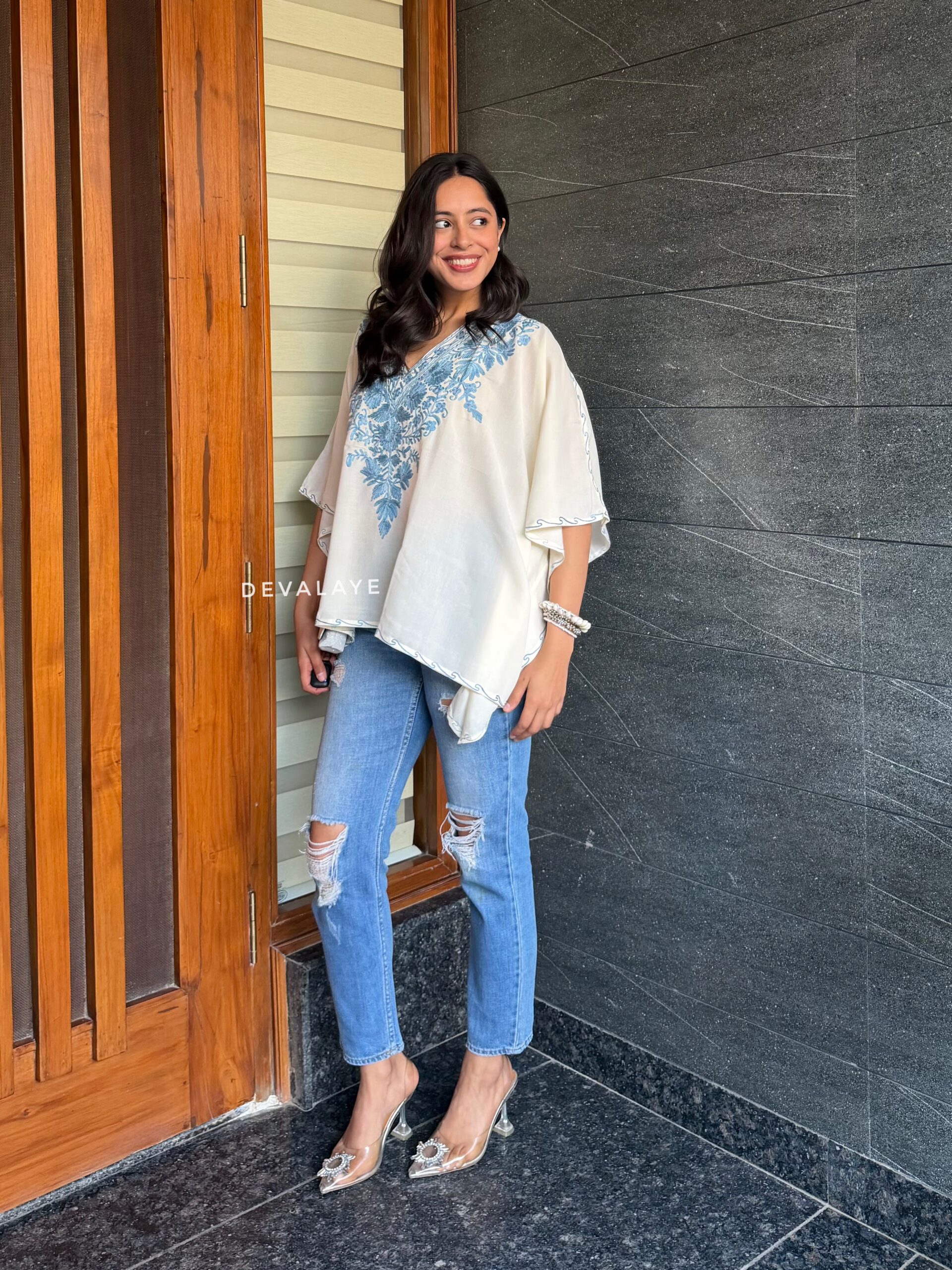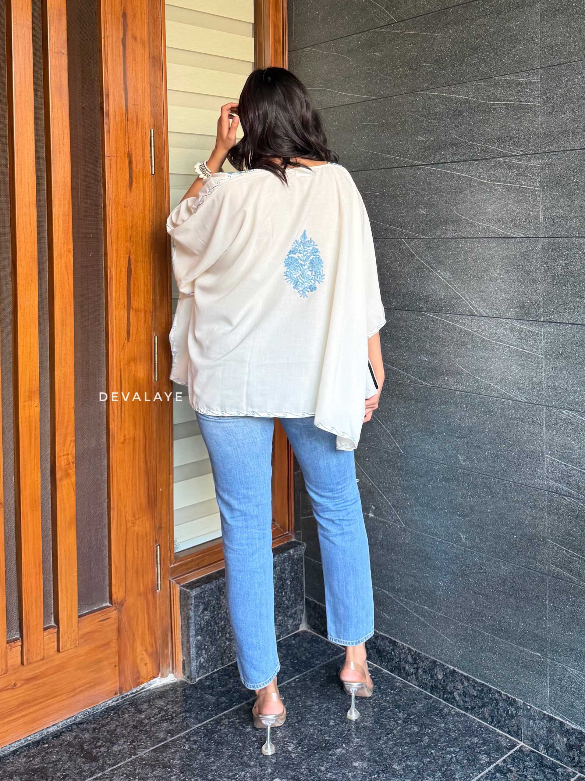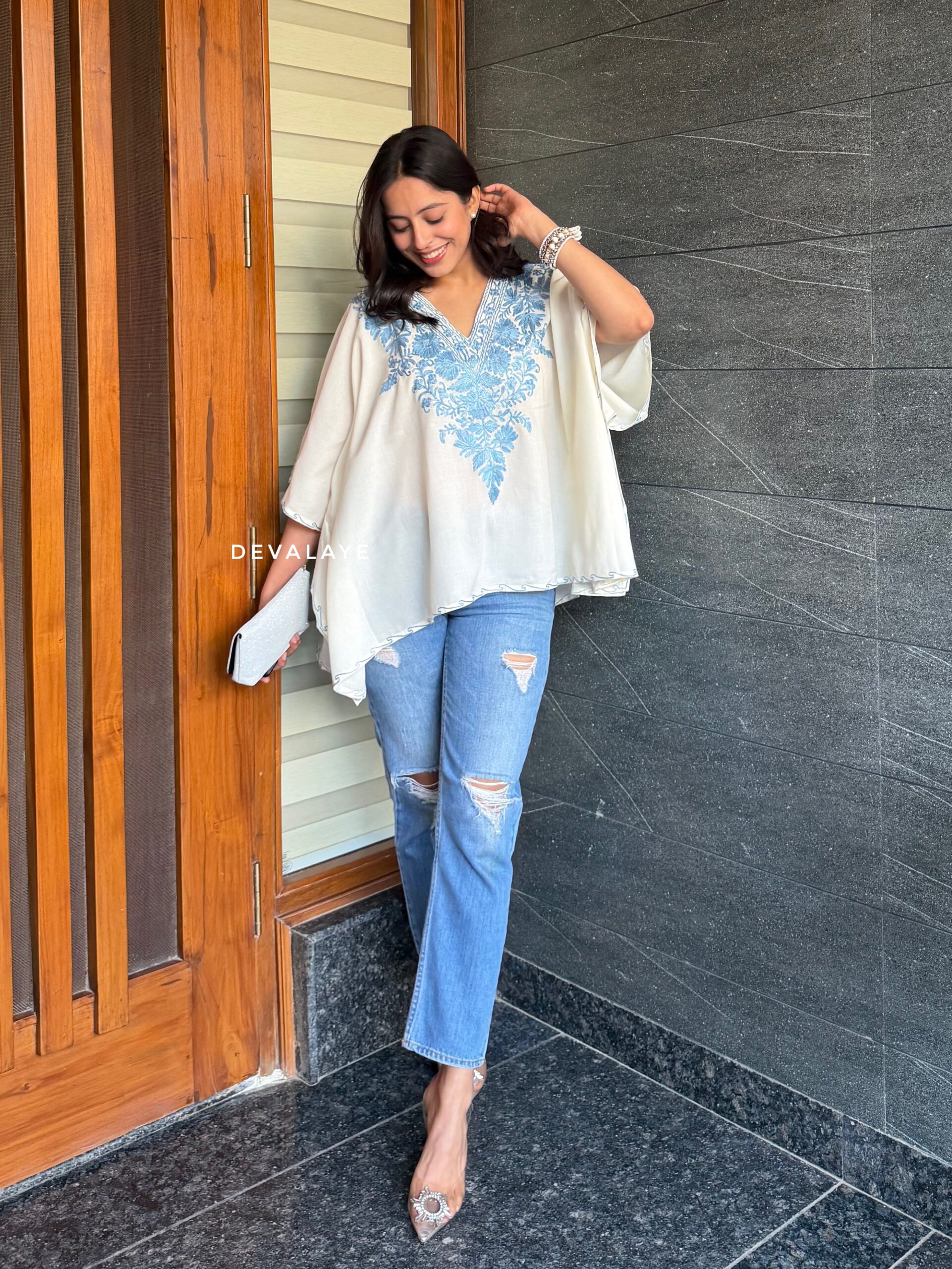 RANG Kaftaan in Blue is a freesize top showcasing Kashmiri Aari embroidery on super soft premium cotton fabric.